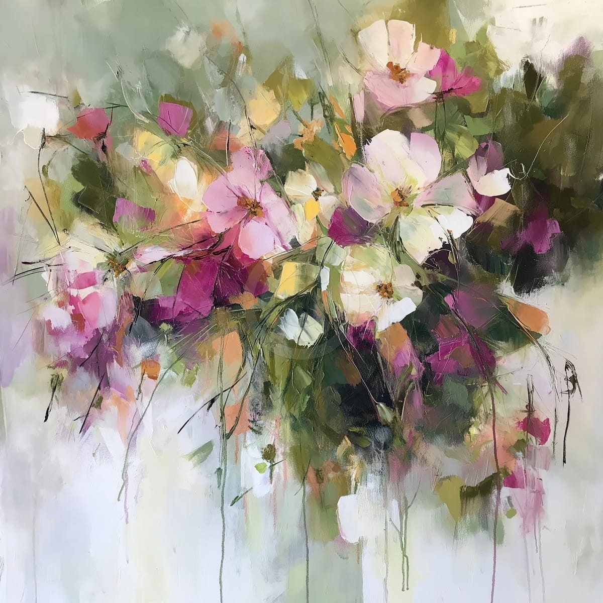 Acest tablou arata un buchet bogat de flori in culori de alb, roz, mov si verde, realizat intr-un stil modern. Culorile sunt aplicate liber si dau senzatia de miscare si prospetime. Fundalul este deschis si simplu, ceea ce scoate florile in evidenta. Compozitia este echilibrata si usor de privit. Culorile sunt vii si placute. Tabloul transmite o stare de energie si naturalete. Este potrivit pentru a aduce culoare si un aspect elegant intr-un interior.