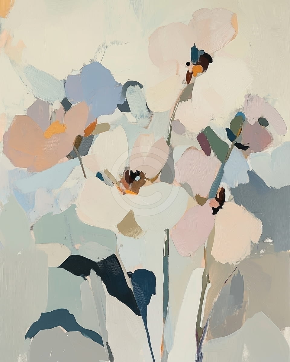 Tabloul infatiseaza un buchet delicat de flori stilizate, redate in nuante pastelate de roz pal, lila, bleu si crem, cu accente discrete de portocaliu si maro. Florile sunt pictate cu tuse largi si fluide, ce sugereaza forma si fragilitatea petalelor fara a le defini strict. Fundalul este luminos si aerisit, cu tonuri deschise de gri-albastrui si bej care adauga o senzatie de calm si rafinament. Frunzele si tulpinile sunt stilizate in verde inchis si albastru, oferind contrast vizual si ancorand compozitia. Intregul tablou emana o atmosfera diafana si moderna, perfecta pentru decoruri elegante si relaxante.