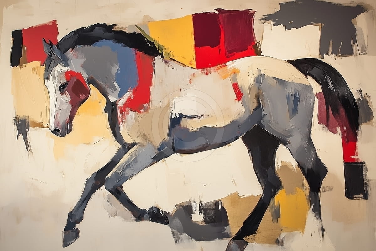 Acest tablou modern surprinde un cal in pas alert, redat intr-o compozitie abstracta si dinamica, cu accente geometrice si blocuri de culoare. Artistul foloseste o paleta de tonuri calde si reci – bej, rosu, galben, gri si albastru – pentru a crea contrast si echilibru vizual. Calul este conturat cu linii ferme si energice, sugerand eleganta si forta in miscare. Fundalul este format din forme neregulate si patrate de culoare, ce confera ritm si textura lucrarii. Compozitia transmite vitalitate si expresivitate. Este o lucrare potrivita pentru interioare contemporane si spatii creative cu personalitate.