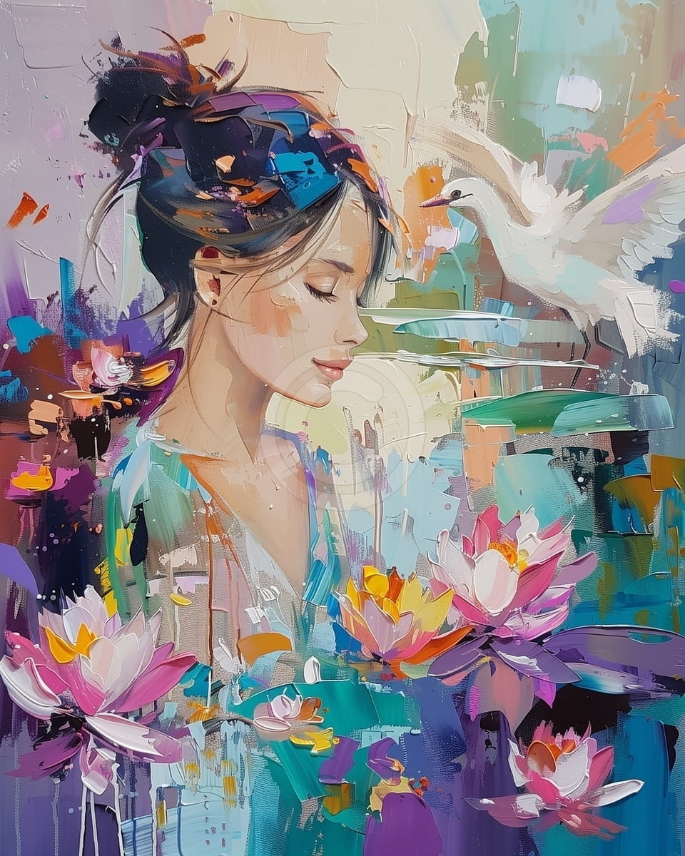 Acest tablou modern si colorat reda portretul unei femei cu chip senin si ochii inchisi, inconjurata de flori de lotus si un fundal abstract plin de culoare. O pasare alba, simbol al pacii si puritatii, zboara discret in partea dreapta, adaugand un plus de armonie imaginii. Paleta cromatica este bogata, cu accente de mov, turcoaz, roz si portocaliu, oferind un efect vizual vibrant si elegant. Stilul pictural combina elemente realiste cu detalii abstracte, conferind profunzime si emotie. Este ideal pentru a decora un spatiu care invita la relaxare si visare. Potrivit pentru dormitoare, sali de lectura sau colturi zen.