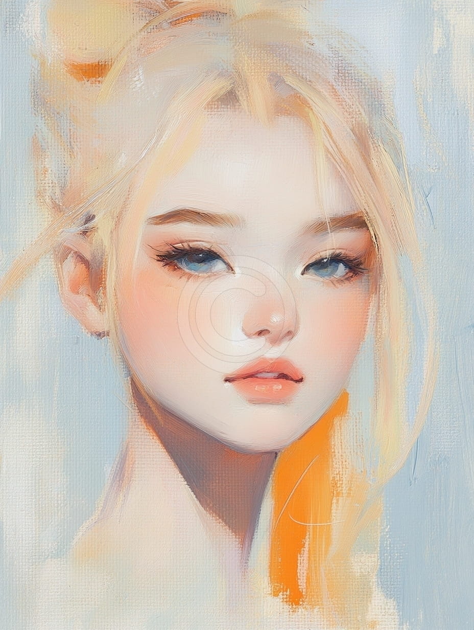 Acest tablou delicat reda chipul unei fete blonde cu trasaturi fine si privire senina, pictata intr-un stil modern cu accente de pictura digitala si pastel. Tonurile calde de piersica si albastru pal se imbina armonios, conferind imaginii un aer luminos si eteric. Pielea este neteda, aproape translucida, iar parul blond este reprodus cu tuse vaporoase. Fundalul deschis amplifica senzatia de puritate si rafinament. Este o lucrare ideala pentru decoruri minimaliste, feminine sau spatii de relaxare. Tabloul transmite eleganta, gratie si tinerete.