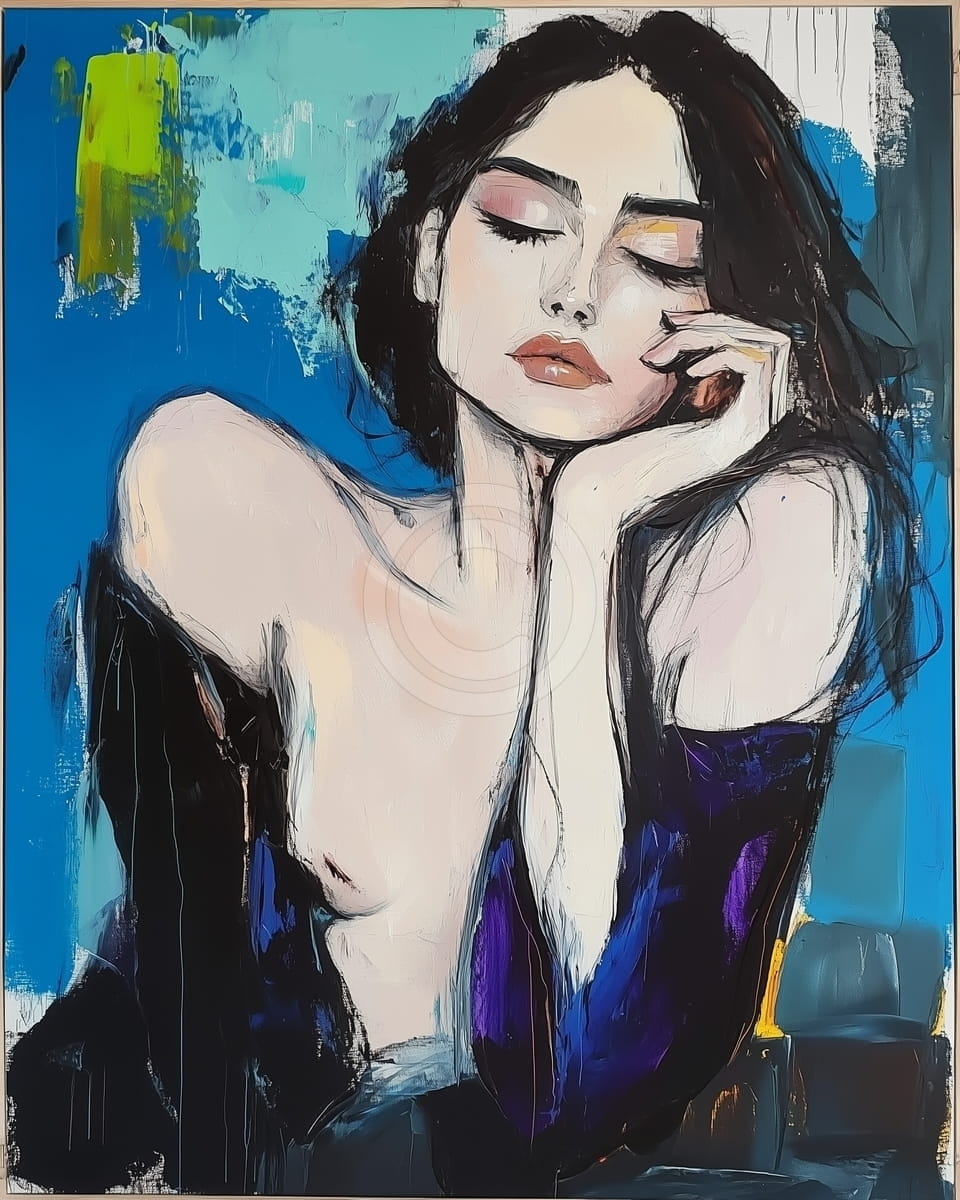 Acest tablou modern portretizeaza o femeie cu ochii inchisi si expresie visatoare, sprijinindu-si delicat capul in palma. Fundalul intens in tonuri de albastru si turcoaz scoate in evidenta pielea deschisa si trasaturile fine ale chipului. Liniile conturate cu negru accentueaza expresivitatea si eleganta figurii feminine. Elemente de galben si violet adauga dinamism si echilibru cromatic lucrarii. Postura relaxata si senzuala a modelului transmite o stare de reverie si calm profund. Este un tablou care combina senzualitatea cu rafinamentul artistic contemporan.