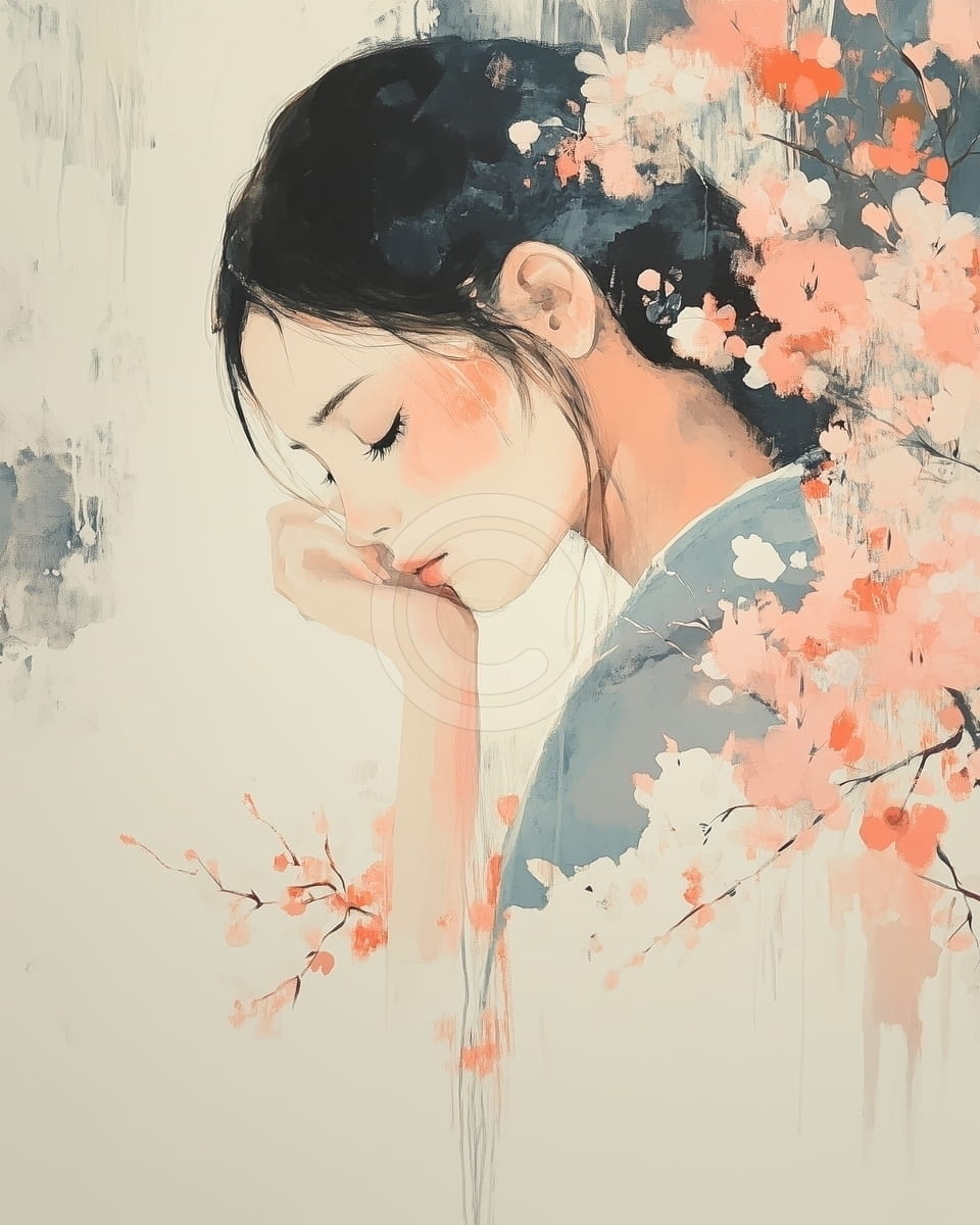 Tabloul infatiseaza o fata cu ochii inchisi, asezata in profil si invaluita intr-o atmosfera delicata de liniste si visare. Chipul sau este pictat cu tonuri calde si usoare, cu obrajii imbujorati si expresie calma. Parul este prins simplu, iar fundalul este decorat cu ramuri inflorite in nuante pastelate de roz si alb. Rochia bleu si textura diafana a compozitiei adauga senzatia de lejeritate si puritate. Intregul tablou transmite emotie, blandete si armonie cu natura. Imaginea evoca un moment de liniste interioara si frumusete poetica.