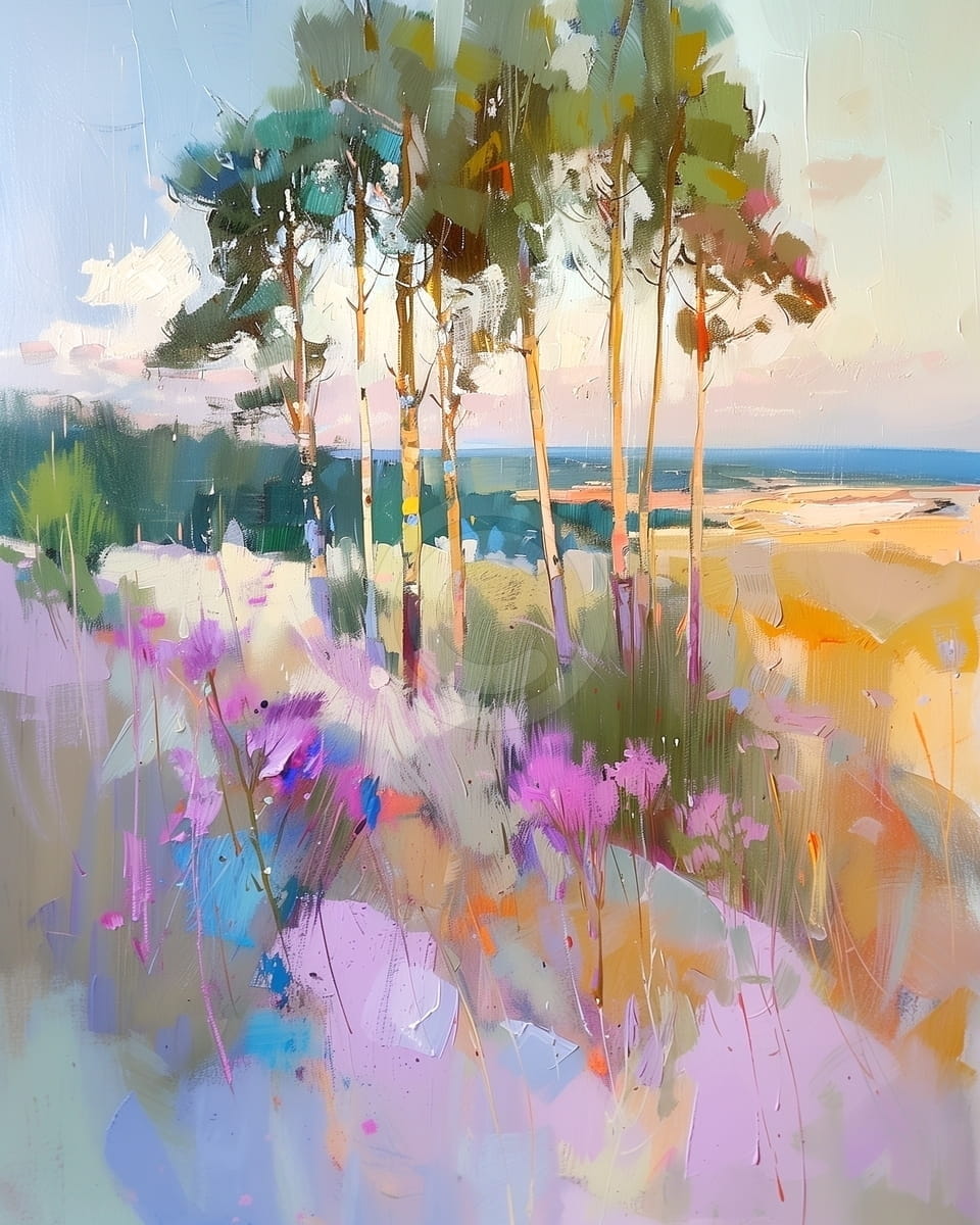 Acest tablou reda un peisaj luminos, in care un grup de copaci inalti se profileaza pe fundalul unui camp deschis si al cerului senin. In prim-plan se afla o zona plina de flori in nuante de mov, roz si albastru, pictate cu tuse largi si expresive. Culorile pastel si compozitia aerisita creeaza o senzatie de prospetime si libertate. Fundalul deschis cu vedere spre mare sau o campie alungita adauga profunzime. Stilul este modern, cu accente abstracte care confera vibratie vizuala. Este ideal pentru interioare relaxante si spatii cu lumina naturala.